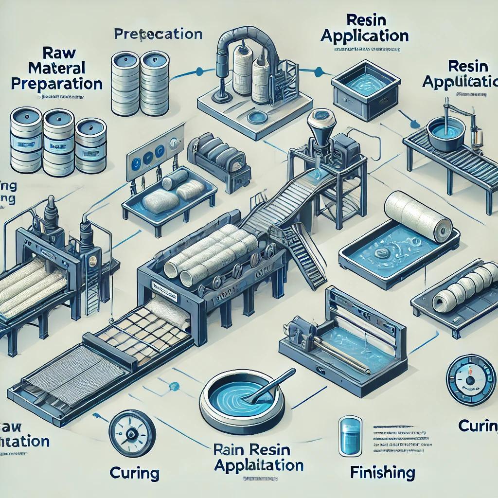 1. آماده‌سازی مواد اولیه: مواد اولیه اصلی شامل الیاف شیشه، رزین پلی‌استر یا اپوکسی، کاتالیزورها و افزودنی‌های مخصوص است.